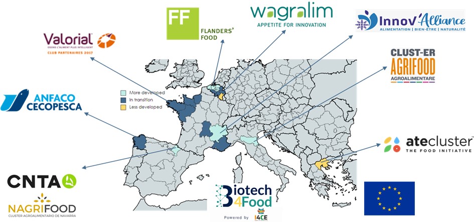 The Biotech4Food consortium finds its origin in the existing Thematic Smart Specialisation Partnership ‘Ingredients for a Circular Economy’ (I4CE). The consortium is composed of seven agrifood innovation clusters, 2 RTOs,
